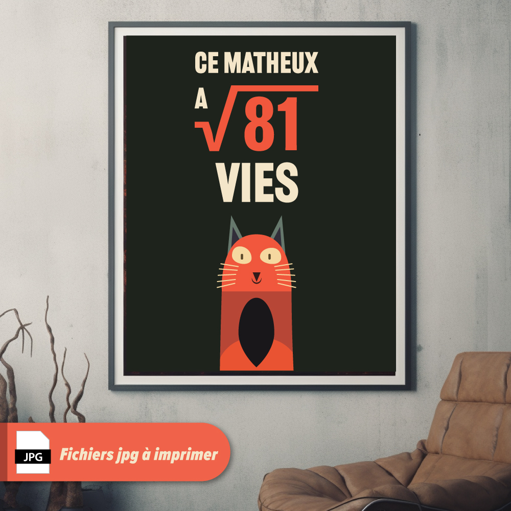 Affiche représentant un chat matheux. On sait tous que les chats ont 9 vies. Illustration à imprimer par soi-même ou chez un imprimeur.